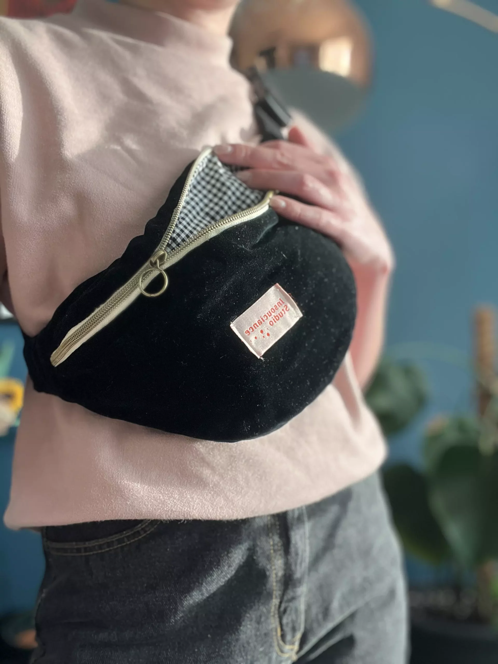 Composition : Banane velours extérieur et doublure vichy / Fermeture en métal doré et écru/ Sangle réglable en coton écru avec boucle coulissante.